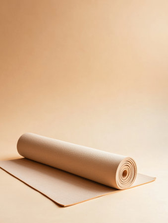 Muted tones of a rolled yoga mat on a soft light background create a serene atmosphere perfect for yoga practice or meditation.