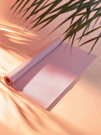 A yoga mat rests diagonally on a soft surface surrounded by soft shadows, creating a calm and minimalistic atmosphere perfect for practice.