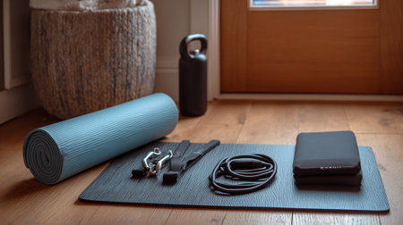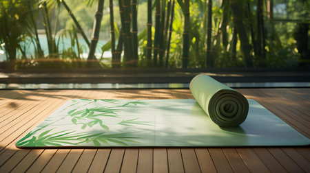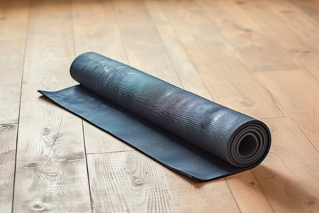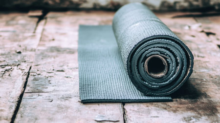 A rolled yoga mat rests on a rustic wooden floor, creating an inviting atmosphere for fitness and meditation. This setting enhances tranquility and promotes wellness.