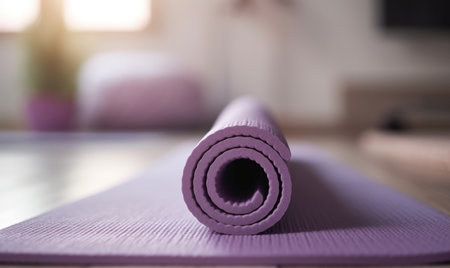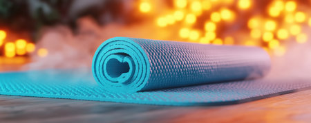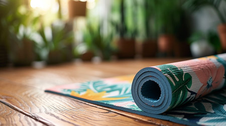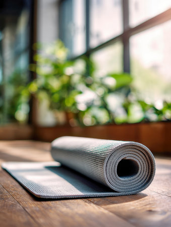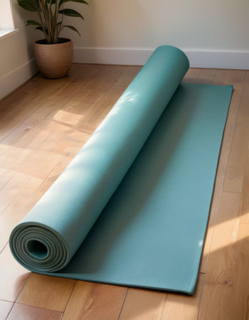 Rolled up yoga mat resting on a wooden floor in a sunlit room, creating a serene environment for exercise, relaxation, and mindfulness, ideal for promoting a healthy lifestyle