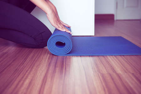 Woman hand rolling or folding blue yoga mat after a workout,Exercise equipment