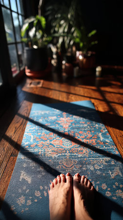 A serene yoga session on patterned mat with sunlight streaming through window, surrounded by indoor plants