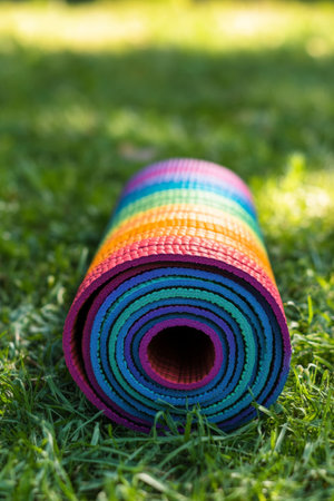 Rainbow colored yoga mat is rolled up on lush green grass in a lively city park, perfect for outdoor yoga sessions and meditation.