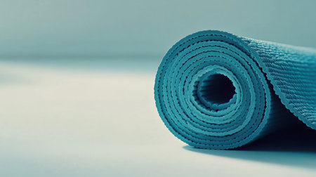 A rolled-up light blue yoga mat rests elegantly on a smooth surface, symbolizing tranquility and mindfulness in fitness practices. Ideal for exercise enthusiasts.