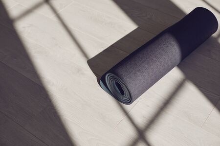 Black yoga mat on the floor of a bright sunny studio. The concept of an active lifestyle of sports life sports fitness yoga pilates meditation relaxation relaxation gym.
