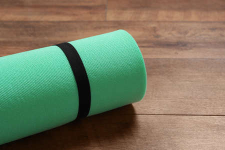 Bright rolled camping mat on wooden background, closeup. Space for text