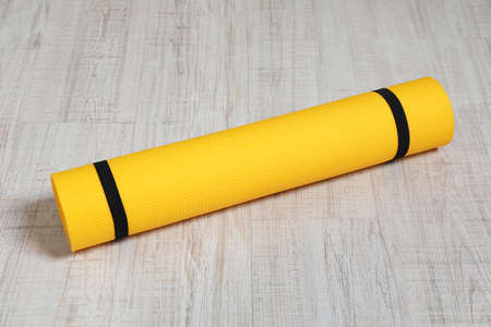 Bright rolled camping mat on white wooden background