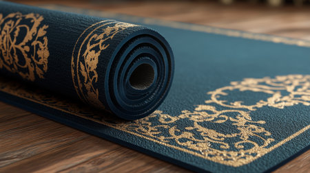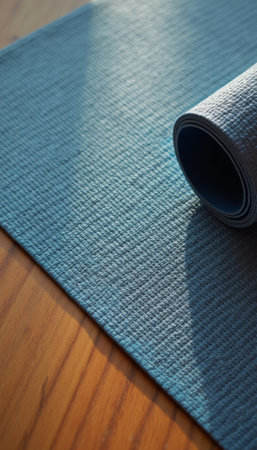 A serene blue yoga mat is partially rolled up on a warm wooden floor, inviting tranquility and mindfulness. The soft texture and gentle light create a peaceful atmosphere, perfect for relaxation and meditation.