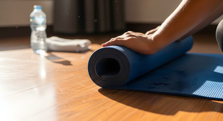 Close-up of a woman's hands rolling up a blue yoga mat on a wooden floor after a workout. A water bottle and towel are visible in the background, highlighting a healthy home fitness routine.
