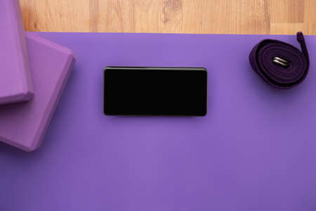 Blank horizontal phone on purple yoga mat with blocks and strap. Top view. Health app concept.