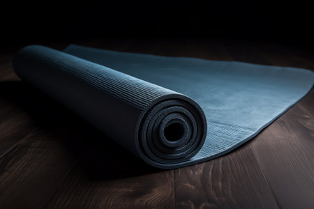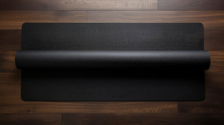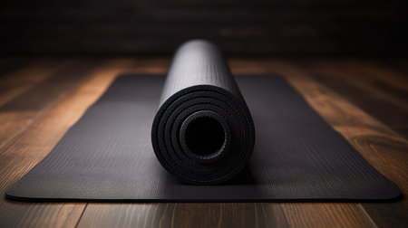 A rolled black yoga mat rests neatly on a smooth surface, illuminated by soft light in the background.