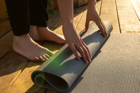 Closeup of woman after fit training, folding her yoga mat outside. Fitness, sport and healthy lifestyle.