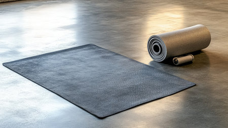 A rolled yoga mat lies on a smooth floor, inviting for a calming exercise session in a peaceful environment.