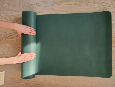 Hands of young woman rolling green yoga or fitness mat. Healthy lifestyle concept, copy space.