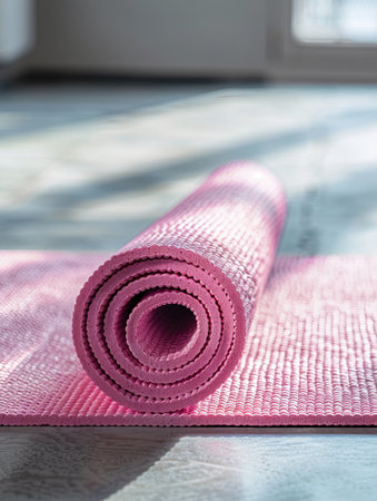 A rolled pink yoga mat rests on a wooden floor, capturing soft natural light. The serene setting invites relaxation and practice in a cozy atmosphere.