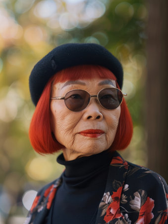 Portrait of asian senior woman in hat looking at camera.