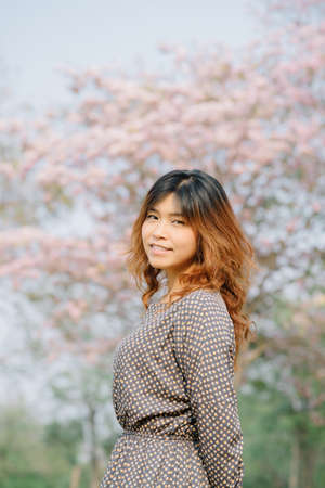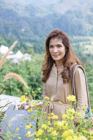 Thai Woman with Flower Garden Background at Chiang Mai Province, Thailand.