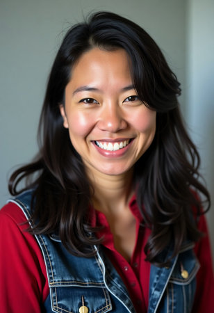 Asian woman in blue jeans shirt smiling