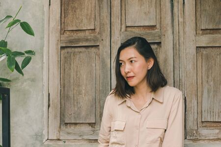 Shoot photo Asian woman portrait wear white shirt and looking sideways with wooden wall background (Vintage filter effect)