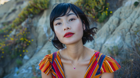 A woman with a red lipstick and orange shirt sitting on the ground, AI