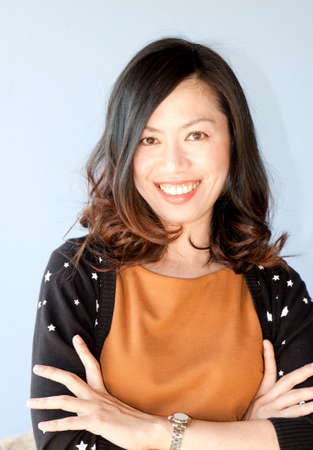 Portrait of a beautiful asian woman smiling on blue sky background