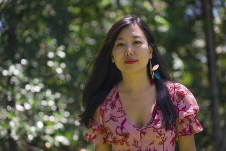 outdoors Summer lifestyle portrait of young beautiful and happy Asian Korean woman in elegant dress walking tranquil and cheerful in green city park or wood in harmony and serenity