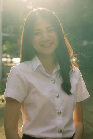 Portrait of thai china adult beautiful girl White shirt blue jeans relax and smile.