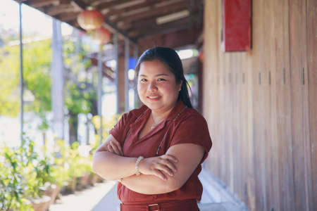 An senior woman is standing, arms crossed and smiling happiness in her garden. Asian aged woman, short hair, gray and white alternately , wrinkled skin and she's have postitive thinking for life