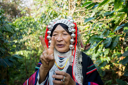 Chiang Mai, Thailand; 1st January 2023: Elderly woman from the indigenous Akha tribe of northern Thailand on an organic coffee plantation.