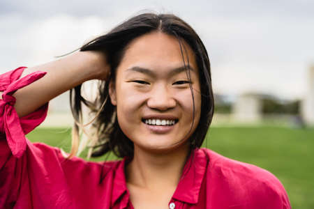 Happy Asian woman having fun in a park
