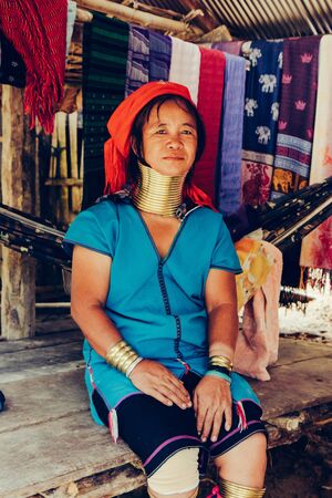 Portrait of Long Neck Woman weave cloth in front her house in tribal village Northern Thailand.