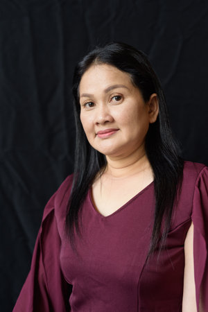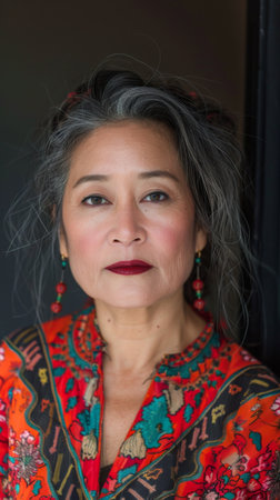 Portrait of stylish mature Asian woman against black studio background