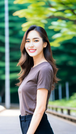 photo of beautiful asian woman with brown top posing standing at pavement street, generative AI