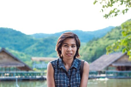 Portrait Asian woman Background with trees And Srinakarin Dam at Huay Mae khamin waterfall National Park ,Kanchana buri in Thailand.