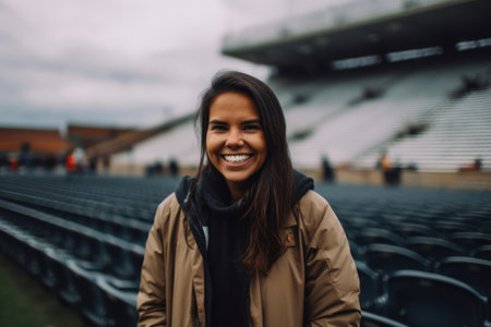 Portrait of a beautiful young latin woman in trench coat smiling and looking at the camera while standing at the stadium