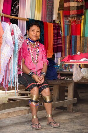 Long Neck Woman weave cloth in front her house in tribal village Northern Thailand.