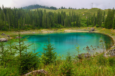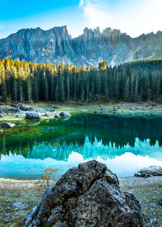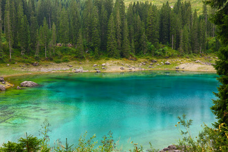view of the Lake Carezza (Karersee) in Italy with beautiful and colorful transparent waters