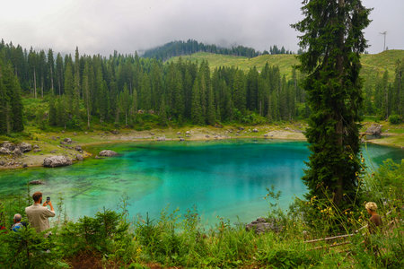 The astonishing colours of the water of the Karersee, in Trentino, during a rainy day