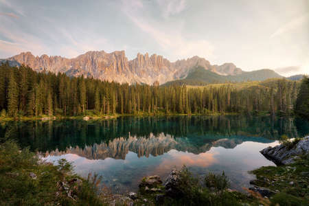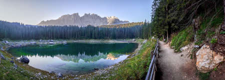 Panoramic view and Dolomites mountains at Carezza lake, Alto Adige or Sudtirol of Italy. Landscape with Karersee and Dolomiti of Alps, Sud Tirol. Alpine scenery of Tyrol. Nature in morning at sunrise