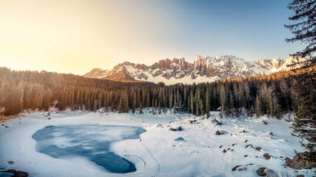 Carezza lake in winter with frosty surface. In the background there are a pinewood and some snowy mountains.
