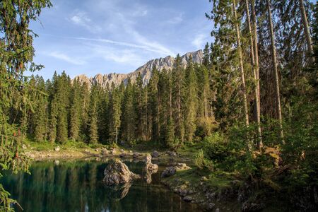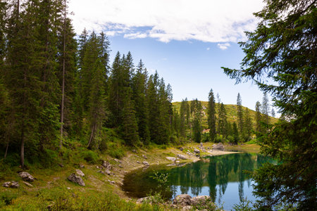 Karersee small alpine lake in Dolomites in South Tyrol, Italy
