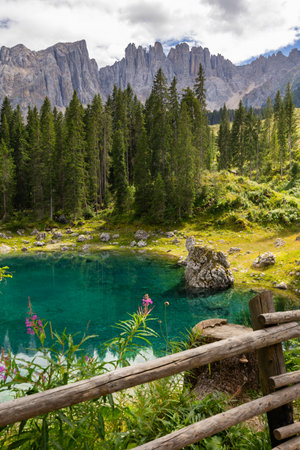 Stunning Carezza lake in summer, Dolomites, Italy