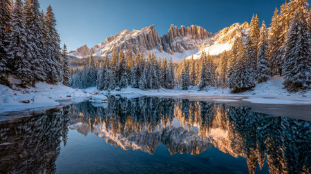 A tranquil winter scene showcases frosted pines mirrored perfectly in a glassy mountain lake, with golden peaks glowing softly as the sun dips below the horizon.