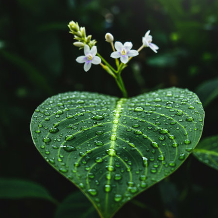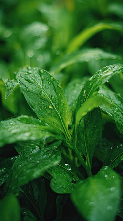 This close-up image showcases vibrant green leaves adorned with glistening raindrops, evoking a fresh and serene atmosphere that highlights nature's beauty.