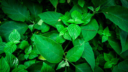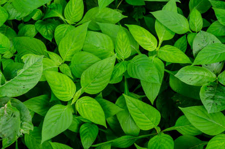 Top view of Wildbetal Leafbush (Piper sarmentosum Roxb.). Green leaves texture background. Herbal medicine. Natural source of calcium food from herbs leaves. Green leaves in jungle for organic concept