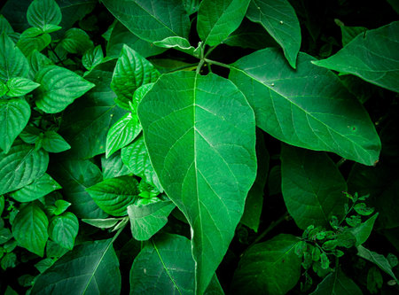 Green leaves background. Green leaves color tone dark in the morning. Tropical Plant,environment,photo concept nature and plant.
