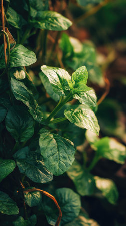 A wide shot of Malabar spinach swaying gently in the wind, realistic photography style, bright and vivid colors, natural lighting.