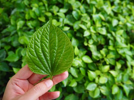 Piper Sarmentosum or Chaplo is an herb that can be used for cooking food. Hand held or captured Chaplo leaves.