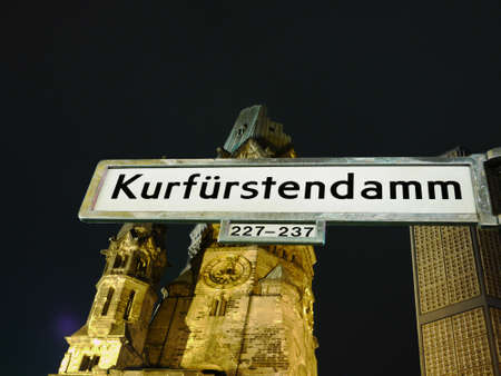 Berlin, The Kaiser Wilhelm Memorial Church by night, in front of it the street sign of Berlins most famous street, Berlin, die Kaiser-Wilhelm-Gedächtniskirche am Kurfürstendamm, im Vordergrund das Staßenschild von Berlins Flaniermeile
