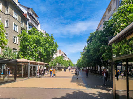 SOFIA, BULGARIA -MAY 5, 2020: Walking people on Boulevard Vitosha in city of Sofia, Bulgaria